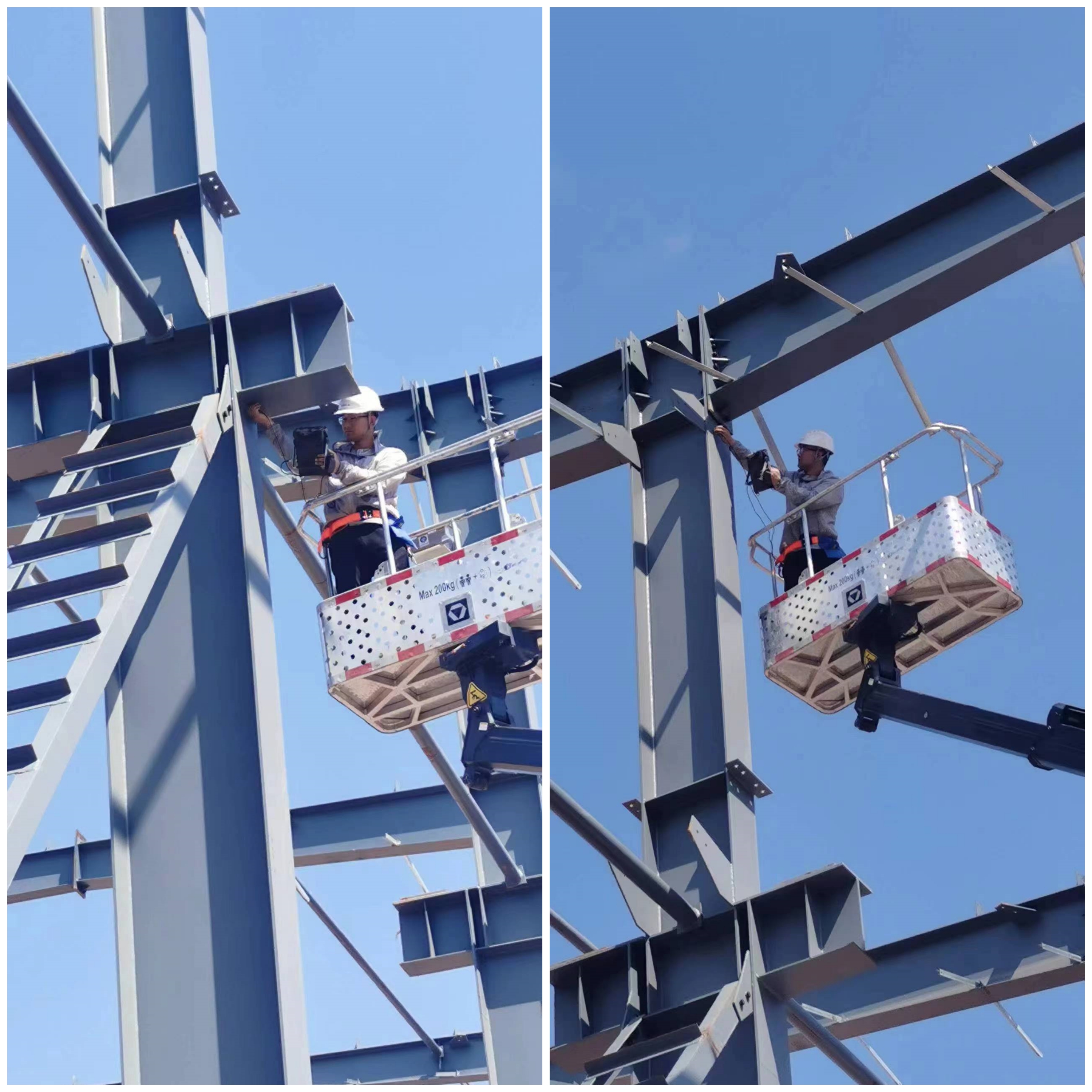 在安徽浙建鋼結(jié)構(gòu)有限公司年產(chǎn)6萬噸鋼構(gòu)件項(xiàng)目現(xiàn)場(chǎng),技術(shù)人員對(duì)鋼結(jié)構(gòu)進(jìn)行現(xiàn)場(chǎng)檢測(cè)。