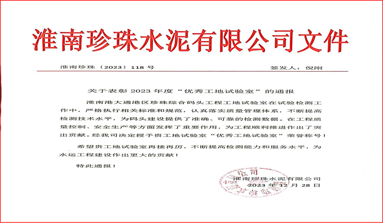 近日,建工檢測路港通公司多個(gè)工地試驗(yàn)室在業(yè)主單位年度考核中獲得“優(yōu)秀工地試驗(yàn)室”表彰。這些榮譽(yù)標(biāo)志著我公司工地試驗(yàn)室檢測服務(wù)得到了業(yè)主方的認(rèn)可,并進(jìn)一步鞏固了路港通在工地試驗(yàn)室管理方面的品牌地位。