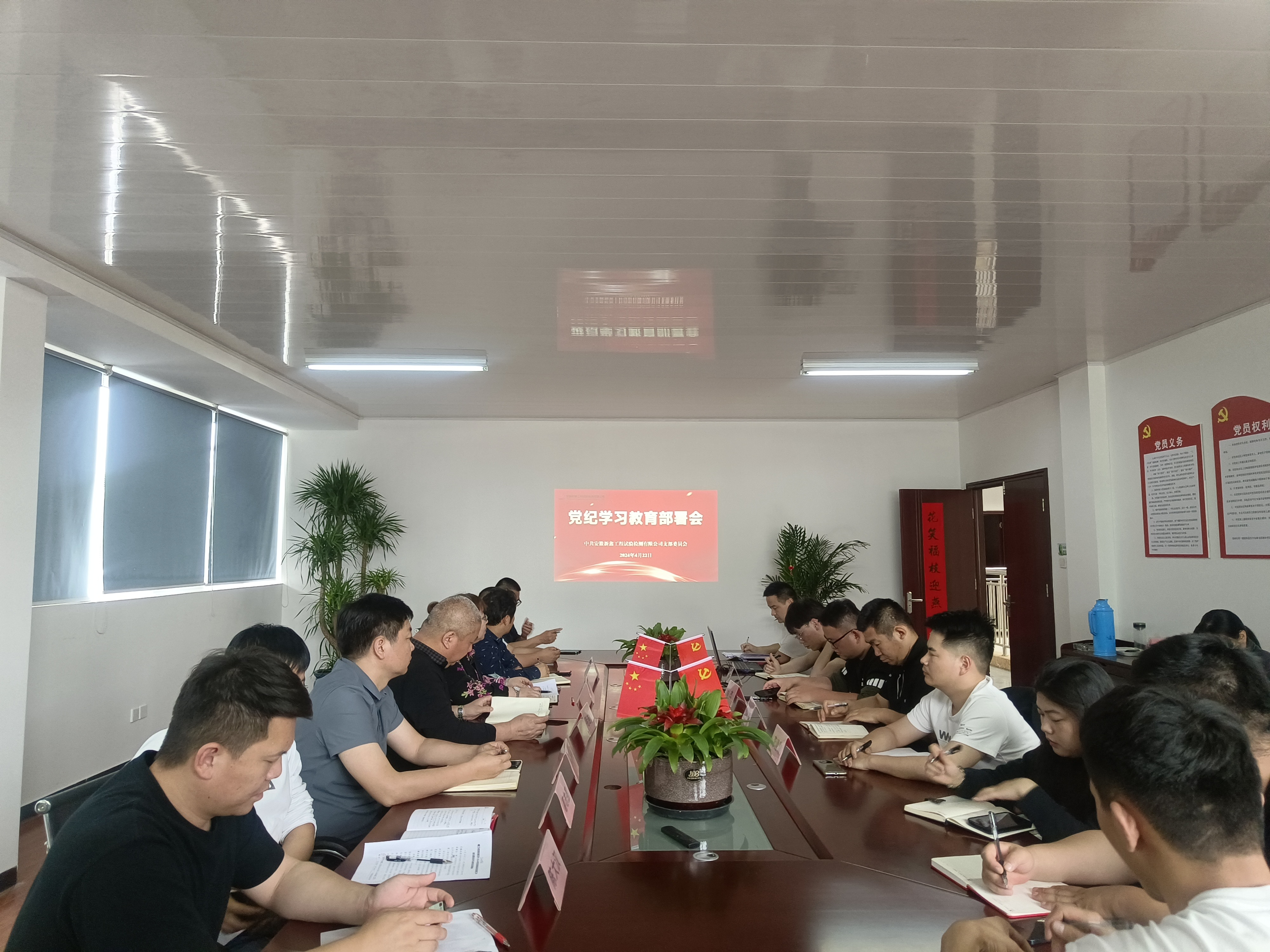 4月25日下午,和達(dá)檢測(cè)黨支部組織召開(kāi)2024年黨風(fēng)廉政建設(shè)和反腐敗工作暨黨紀(jì)學(xué)習(xí)教育動(dòng)員部署會(huì)議。會(huì)議宣貫了集團(tuán)及公司2024年黨風(fēng)廉政建設(shè)和反腐敗會(huì)議精神,并由黨員干部領(lǐng)學(xué)《中國(guó)共產(chǎn)黨紀(jì)律處分條例》部分章節(jié)。會(huì)議要求,一是提高政治站位,嚴(yán)肅認(rèn)真開(kāi)展黨紀(jì)學(xué)習(xí)教育;二是要以身作則,發(fā)揮黨員先鋒模范作用,帶動(dòng)身邊人堅(jiān)守廉潔自律準(zhǔn)則;三是加強(qiáng)宣傳引導(dǎo),利用工作群、公眾號(hào)等載體,營(yíng)造熱烈學(xué)習(xí)氛圍;四是強(qiáng)化學(xué)習(xí)成果運(yùn)用,指導(dǎo)實(shí)際工作規(guī)范開(kāi)展,預(yù)防杜絕微腐敗。