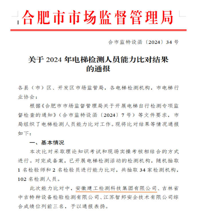 喜報!建工檢測榮獲合肥市2024年電梯檢測質(zhì)量比對競賽冠軍!