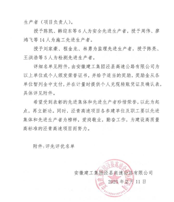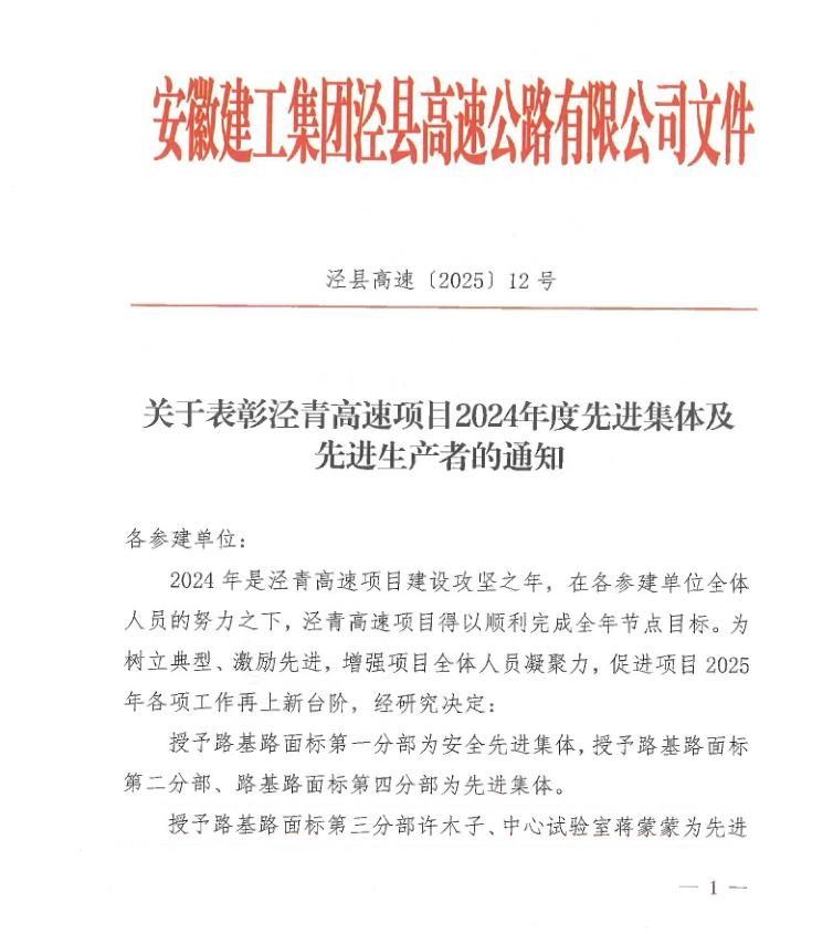 近日,從安徽建工集團涇縣高速公路有限公司傳來喜訊,路橋檢測宣城至東至高速公路涇縣至青陽界段中心試驗室蔣蒙蒙等4位同志分別榮獲2024年度先進生產(chǎn)者(項目負責人)、先進生產(chǎn)者(檢測)人員稱號。