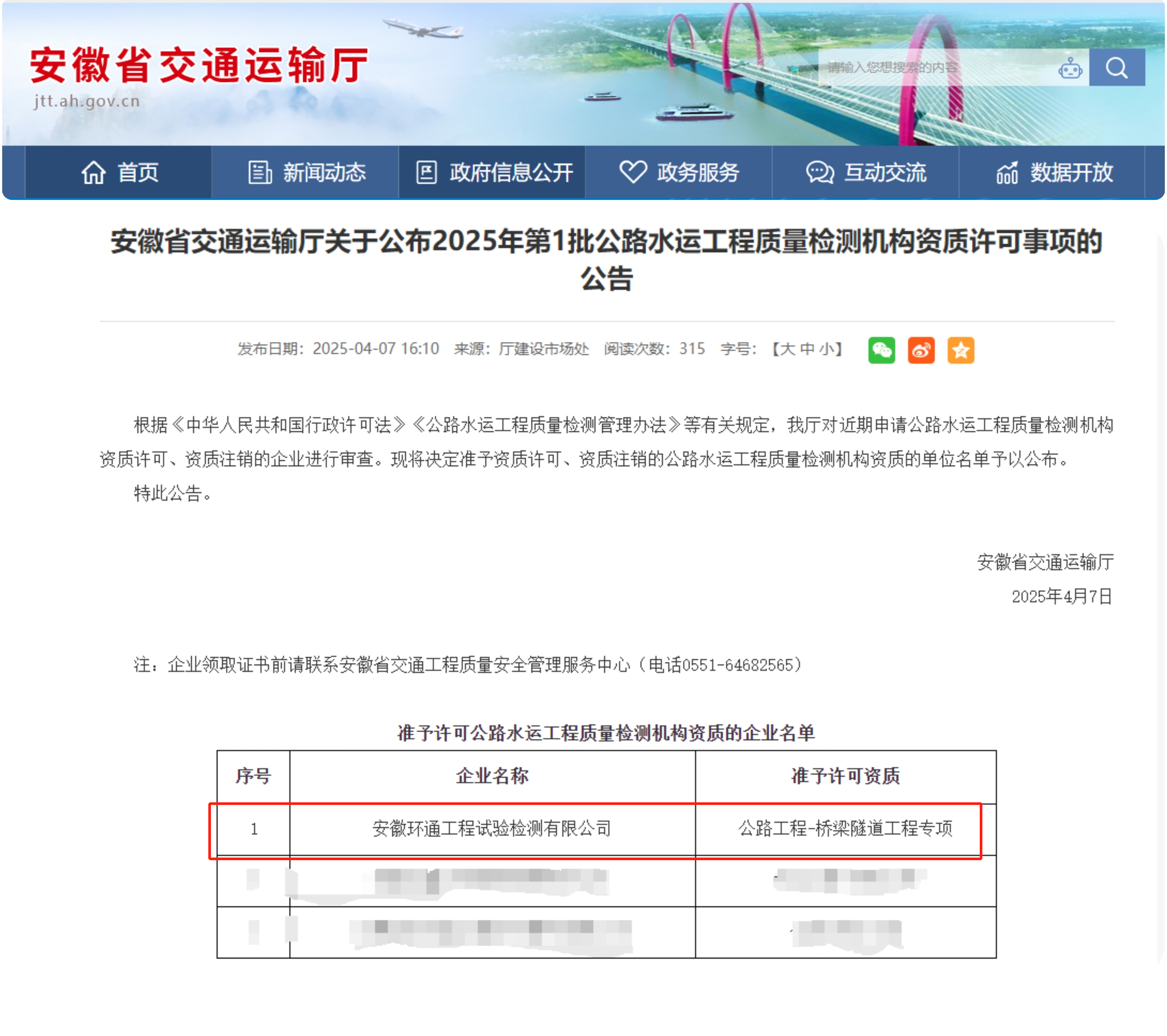 近日,安徽省交通運(yùn)輸廳公布了2025年第1批公路水運(yùn)工程質(zhì)量檢測(cè)機(jī)構(gòu)資質(zhì)許可決定。建工檢測(cè)所屬環(huán)通公司成功取得公路工程-橋梁隧道工程專項(xiàng)資質(zhì)。