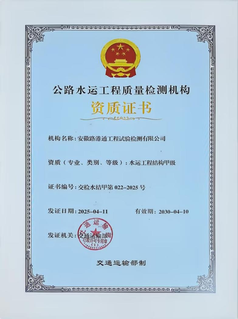 近日,建工檢測(cè)所屬路港通公司成功取得交通運(yùn)輸部頒發(fā)的水運(yùn)工程結(jié)構(gòu)甲級(jí)資質(zhì)證書(shū)。