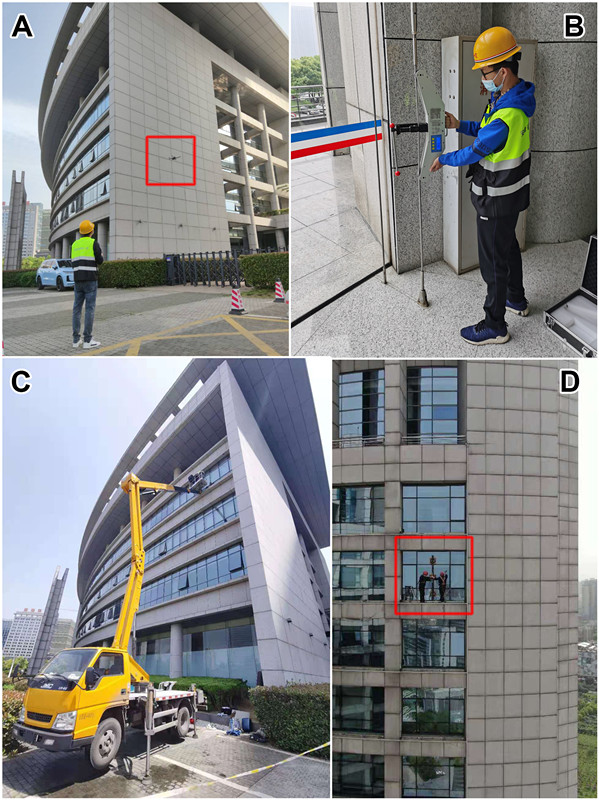 二站幕墻所承接的合肥市政務(wù)綜合樓位于東流路100號,幕墻面積總計10.03萬平方米,包含短槽支承石材幕墻,背栓支承石材幕墻,明框玻璃幕墻,半隱框玻璃幕墻,全隱框玻璃幕墻,自平衡拉索玻璃幕墻,點支承玻璃幕墻和全玻幕墻等多種類型的幕墻。在數(shù)據(jù)采集及取樣過程中,二站幕墻所檢測人員分為無人機組、高空滑板組、登高車組以及應(yīng)急組等4個小組,按計劃有條不紊地進行工作,至5日晚,現(xiàn)場工作全部完成。本次現(xiàn)場工作共計拆卸50余處隱蔽節(jié)點,并全部復(fù)原,無安全事故發(fā)生,現(xiàn)場工作得到委托方的高度評價。