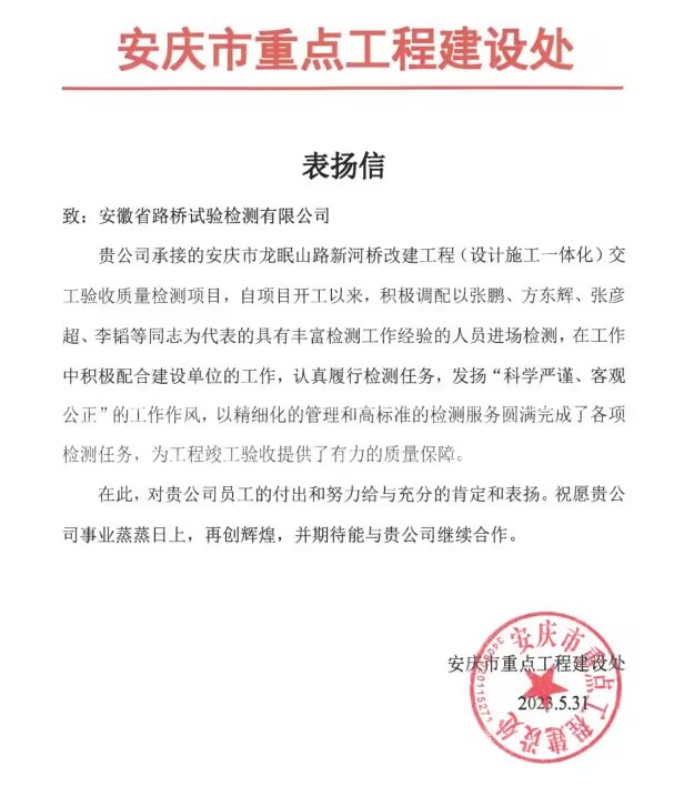 表揚信指出,安徽省路橋試驗檢測有限公司安排豐富檢測經驗的人員進場檢測,在工作中積極配合建設單位工作,認真履行檢測任務,發(fā)揚了“科學嚴謹、客觀公正”的工作作風,以精細化的管理和高標準的檢測服務圓滿完成了各項檢測任務,為工程竣工驗收提供了有力的質量保障。同時安慶市重點工程建設處在表揚信中表達了與檢測公司繼續(xù)合作的期待。