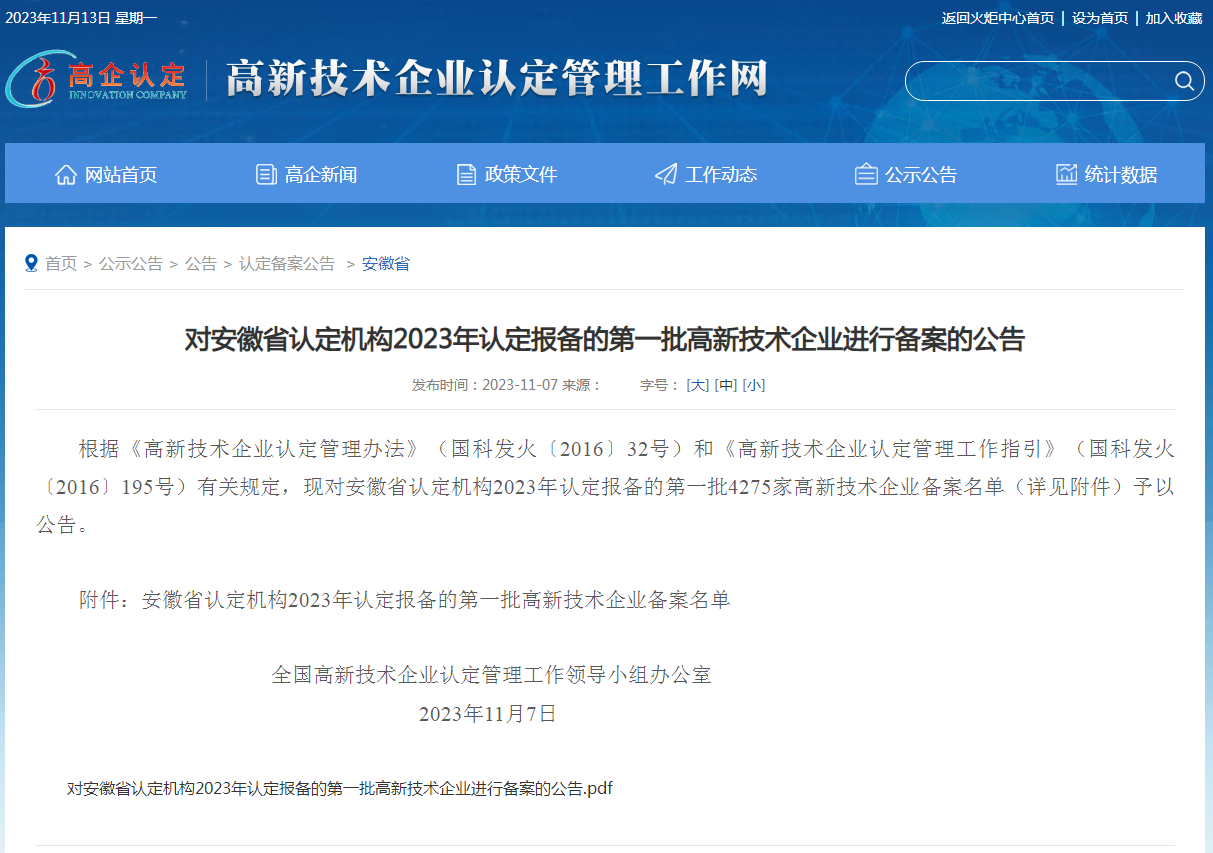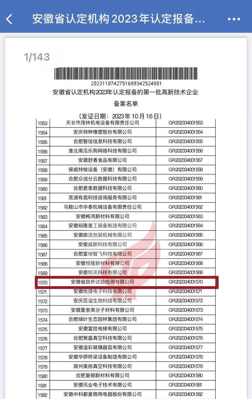 11月7日,全國高新技術(shù)企業(yè)認(rèn)定管理工作領(lǐng)導(dǎo)小組辦公室發(fā)布的安徽省認(rèn)定機構(gòu)2023年認(rèn)定報備的第一批高新技術(shù)企業(yè)備案的名單中,安徽省路橋試驗檢測有限公司赫然在列,這標(biāo)志著我公司再次成功獲得國家高新技術(shù)企業(yè)認(rèn)定。