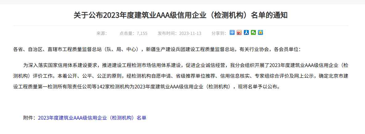 近日,中國建筑業(yè)協(xié)會公布了2023年度建筑業(yè)AAA級信用企業(yè)(檢測機構(gòu))名單,安徽環(huán)通工程試驗檢測有限公司榜上有名。