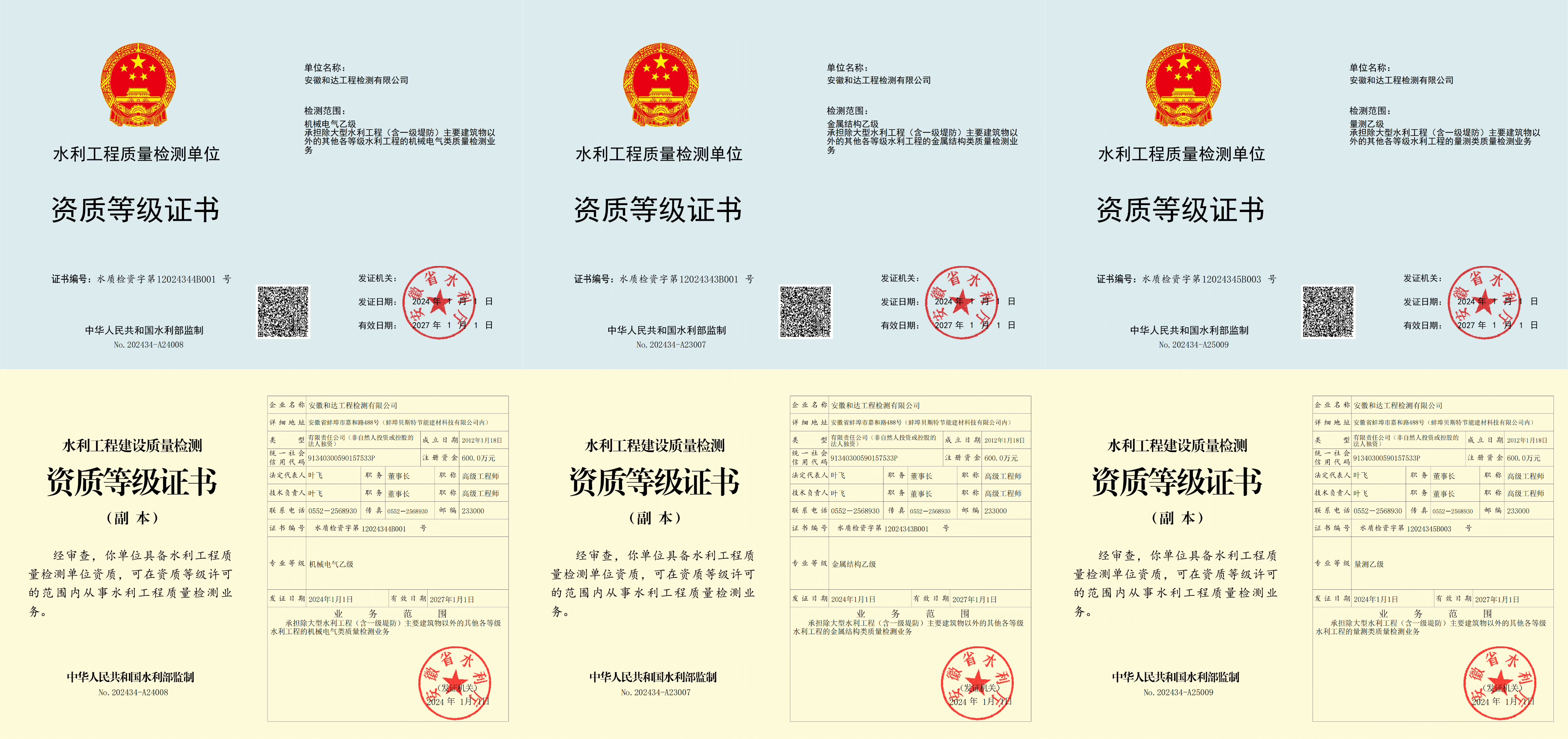 喜報丨新年第一份禮物——和達檢測取得水利工程“金屬結(jié)構(gòu)、機械電氣乙級證書和量測乙級換證復(fù)核證書”