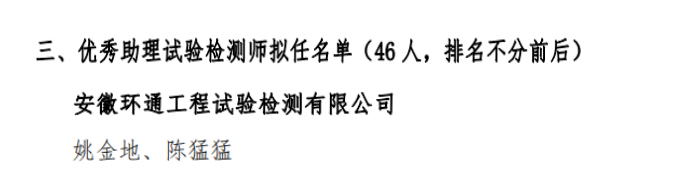 近日,安徽省公路學(xué)會(huì)公布了“2022年度全省交通建設(shè)優(yōu)秀監(jiān)理工程師、試驗(yàn)檢測(cè)師和助理試驗(yàn)檢測(cè)師名單”,建工檢測(cè)環(huán)通公司鄭君紅等12名同志榮獲“優(yōu)秀試驗(yàn)檢測(cè)師”榮譽(yù)稱號(hào),姚金地等2名同志榮獲“優(yōu)秀助理試驗(yàn)檢測(cè)師”榮譽(yù)稱號(hào)。