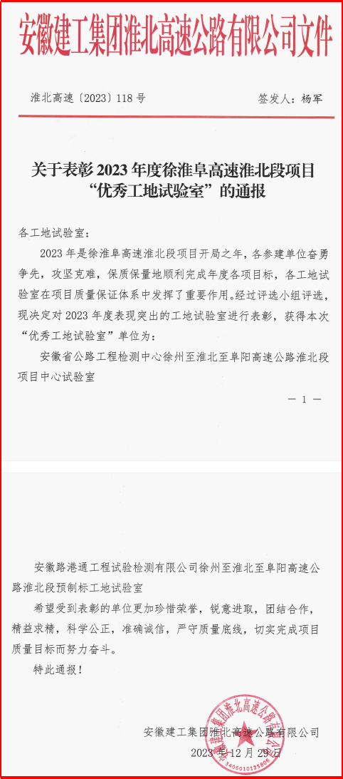 喜報(bào)!建工檢測路港通公司多個(gè)工地試驗(yàn)室榮獲業(yè)主“優(yōu)秀工地試驗(yàn)室”表彰