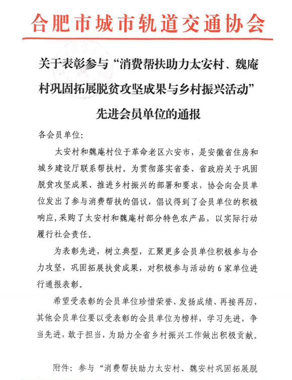 近日,建工檢測榮獲合肥市城市軌道交通協(xié)會表彰參與“消費(fèi)幫扶助力太安村、魏安村鞏固拓展脫貧攻堅(jiān)成果與鄉(xiāng)村振興活動”先進(jìn)會員單位榮譽(yù)稱號。