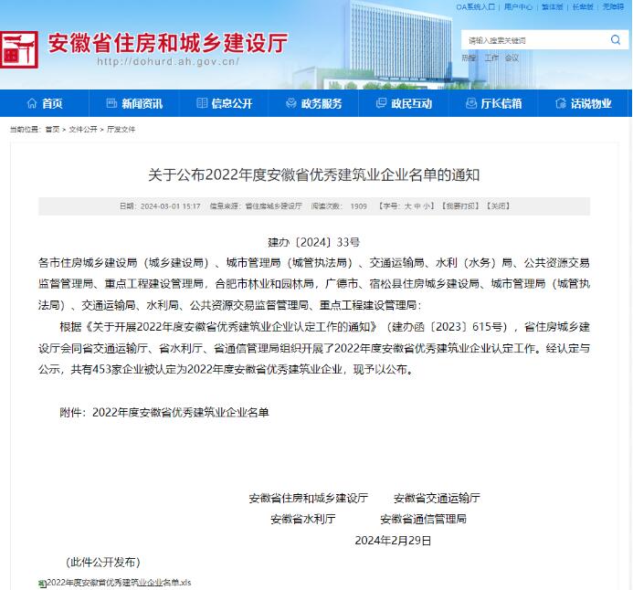 “安徽省優(yōu)秀建筑業(yè)企業(yè)”是由安徽省住房和城鄉(xiāng)建設(shè)廳會(huì)同省交通運(yùn)輸廳、省水利廳、省通信管理局聯(lián)合開(kāi)展的全省優(yōu)秀建筑業(yè)企業(yè)認(rèn)定評(píng)選活動(dòng),是對(duì)安徽省建筑業(yè)企業(yè)綜合實(shí)力的認(rèn)定,旨在充分發(fā)揮優(yōu)秀建筑業(yè)企業(yè)的示范引領(lǐng)作用,提升安徽建筑業(yè)企業(yè)核心競(jìng)爭(zhēng)力和社會(huì)公信力,以“安徽建造”品牌影響力繪制安徽省建筑業(yè)企業(yè)高質(zhì)量發(fā)展新藍(lán)圖。