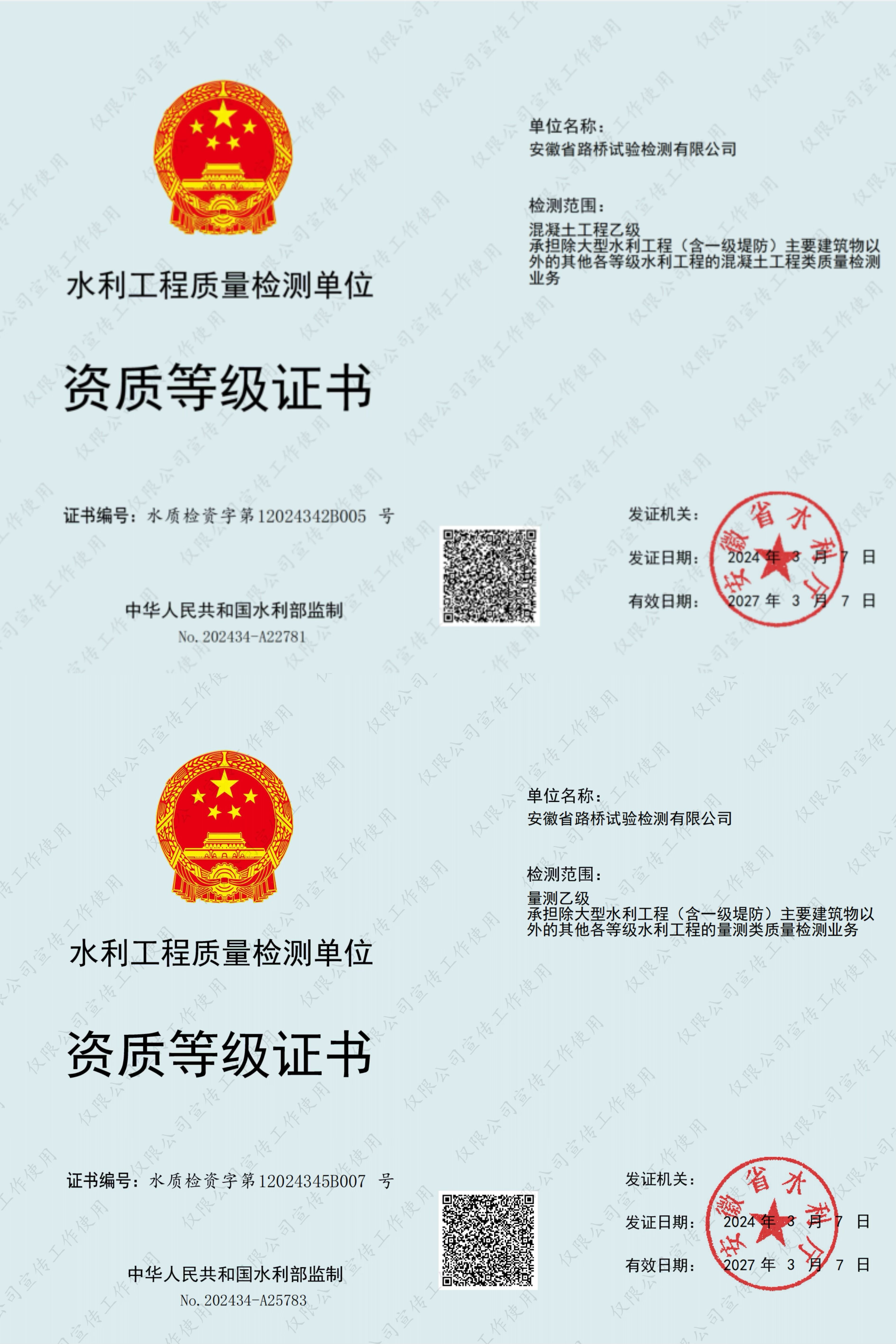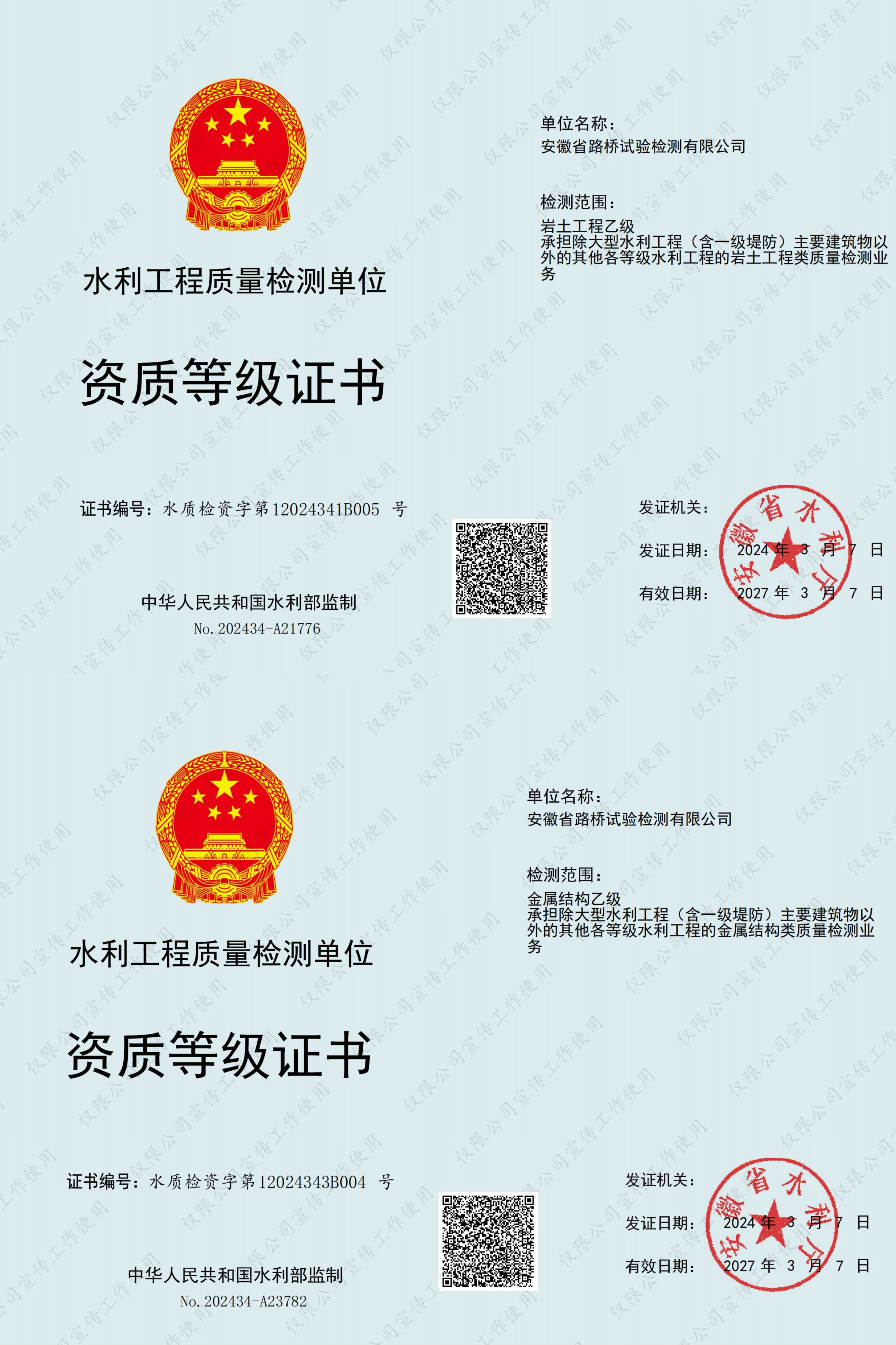 安徽省路橋試驗(yàn)檢測(cè)有限公司順利通過四項(xiàng)水利工程質(zhì)量檢測(cè)乙級(jí)資質(zhì)延續(xù)