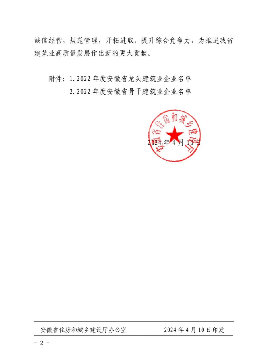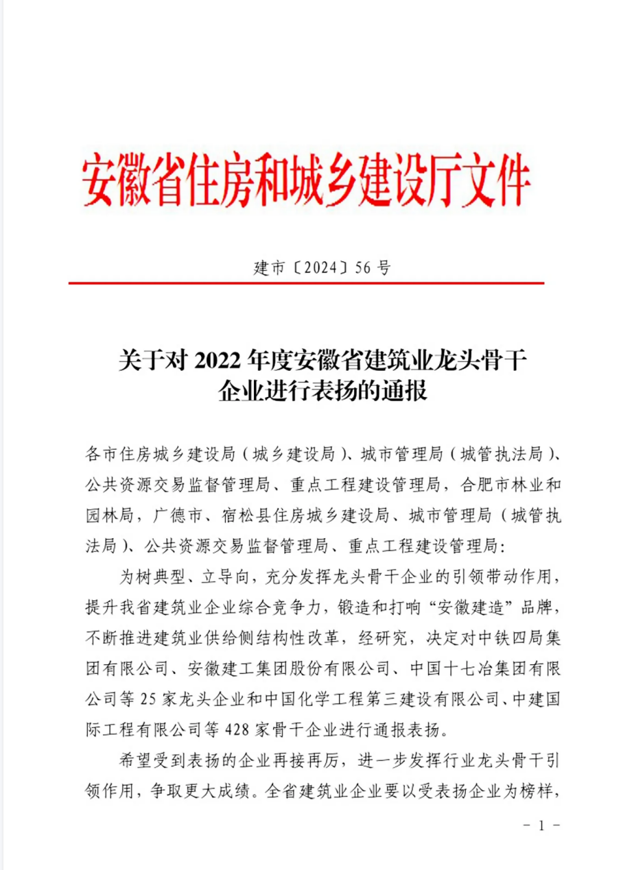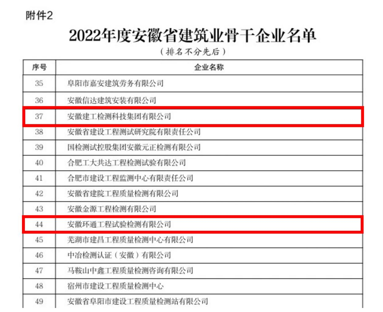 近日,安徽省住房和城鄉(xiāng)建設(shè)廳發(fā)布了“關(guān)于對(duì)2022年度安徽省建筑業(yè)龍頭骨干企業(yè)進(jìn)行表揚(yáng)的通報(bào)”,建工檢測(cè)及所屬子公司環(huán)通檢測(cè)榮登“骨干企業(yè)”榜單。