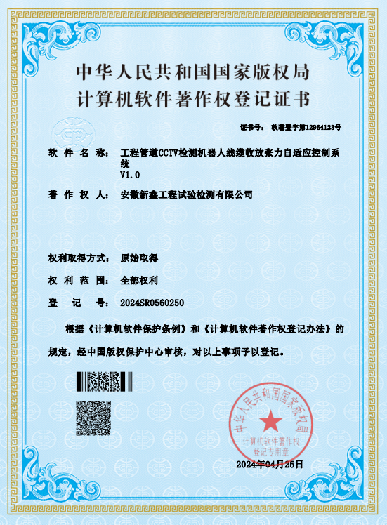近日,安徽新鑫工程試驗檢測有限公司成功獲得5項軟件著作權:工程管道CCTV檢測機器人線纜收放張力自適應控制系統(tǒng)、道路連接結構部件穩(wěn)固性檢測系統(tǒng)、鋼筋混凝土結構保護層厚度檢測與安全評估系統(tǒng)、工程檢測吊錘穩(wěn)定性校準檢測系統(tǒng)、混凝土摻合料抗剪切力安全檢測與管理系統(tǒng)。
