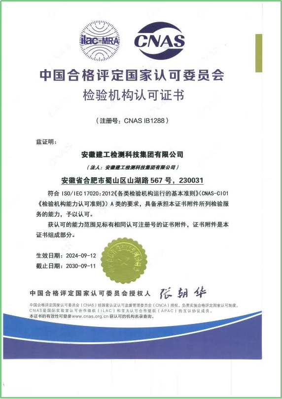 近日,安徽建工檢測(cè)科技集團(tuán)有限公司順利通過(guò)中國(guó)合格評(píng)定國(guó)家認(rèn)可委員會(huì)(CNAS)評(píng)定,獲得檢驗(yàn)機(jī)構(gòu)認(rèn)可證書(注冊(cè)號(hào):CNAS IB1288),為安徽住建領(lǐng)域首家獲證機(jī)構(gòu),同時(shí)成為具備CNAS雙證認(rèn)可(CNAS實(shí)驗(yàn)室認(rèn)可和CNAS檢驗(yàn)機(jī)構(gòu)認(rèn)可)的檢驗(yàn)檢測(cè)機(jī)構(gòu)。