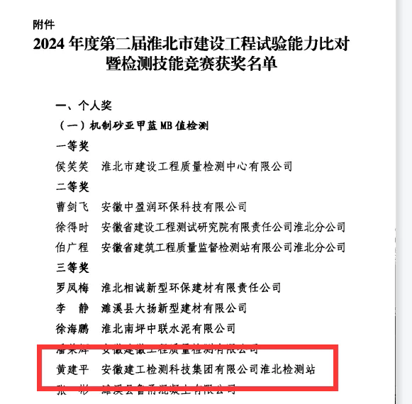 喜報(bào)!淮北檢測站榮獲2024年第二屆淮北市建設(shè)工程試驗(yàn)?zāi)芰Ρ葘︳邫z測技能競賽個人三等獎
