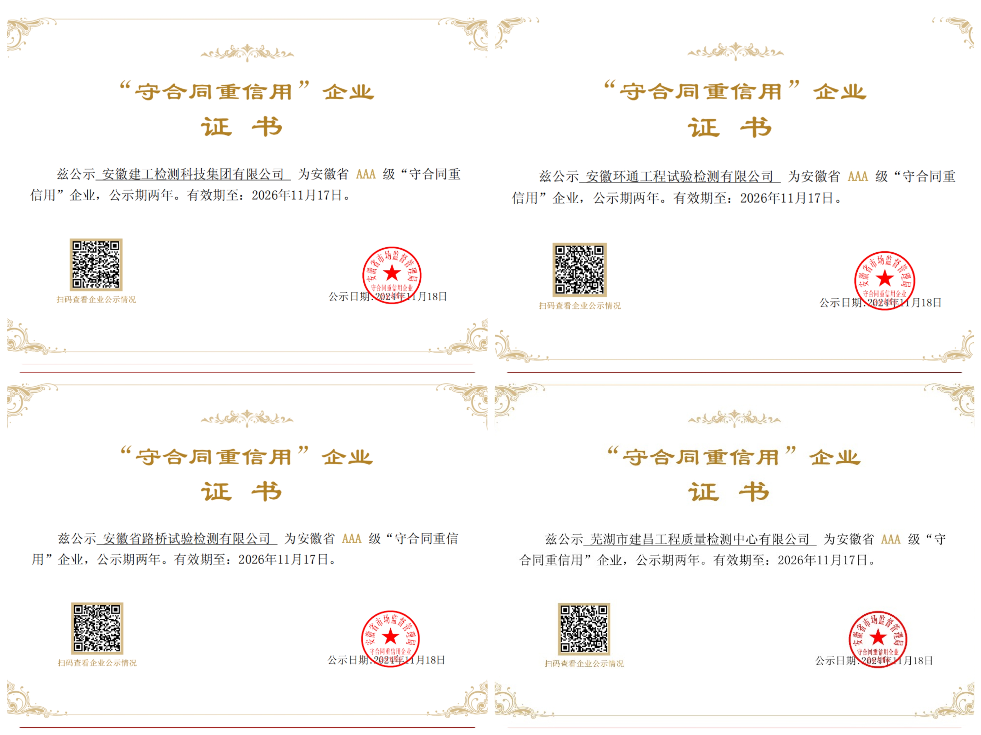 近日,在安徽省市場監(jiān)督管理局開展的2022-2023年度“安徽省守合同重信用”AAA級企業(yè)評級中,我司及所屬子公司安徽省路橋試驗檢測有限公司、安徽環(huán)通工程試驗檢測有限公司、蕪湖市建昌工程質量檢測中心有限公司同時獲評2022-2023年度“安徽省守合同重信用”AAA級企業(yè)。