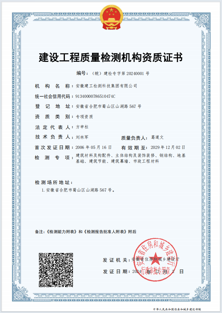 2024年12月31日,經(jīng)安徽省住房和城鄉(xiāng)建設廳核發(fā),公司正式獲批建設工程質(zhì)量檢測建筑材料及構配件、主體結(jié)構及裝飾裝修、鋼結(jié)構、地基基礎、建筑節(jié)能、建筑幕墻、市政工程材料共七項新資質(zhì),成為自住房和城鄉(xiāng)建設部《建設工程質(zhì)量檢測管理辦法》(住房城鄉(xiāng)建設部令第57號)和《建設工程質(zhì)量檢測機構資質(zhì)標準》(建質(zhì)規(guī)〔2023〕1號)印發(fā)以來安徽省首家獲批建設工程質(zhì)量檢測新資質(zhì)的企業(yè)。