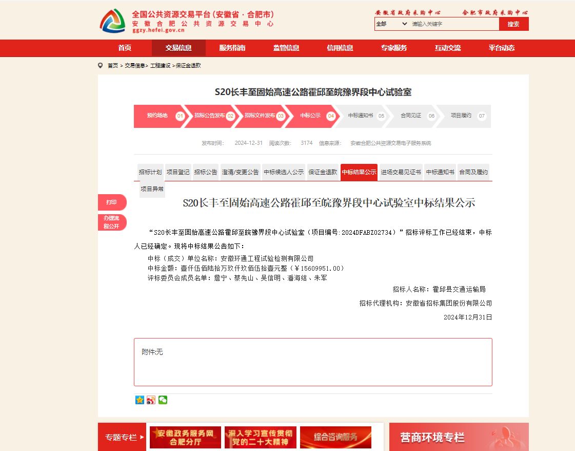 2024年12月31日,建工檢測所屬環(huán)通公司成功中標(biāo)S20長豐至固始高速公路霍邱至皖豫界段中心試驗(yàn)室項(xiàng)目,中標(biāo)金額1560.9951萬元。