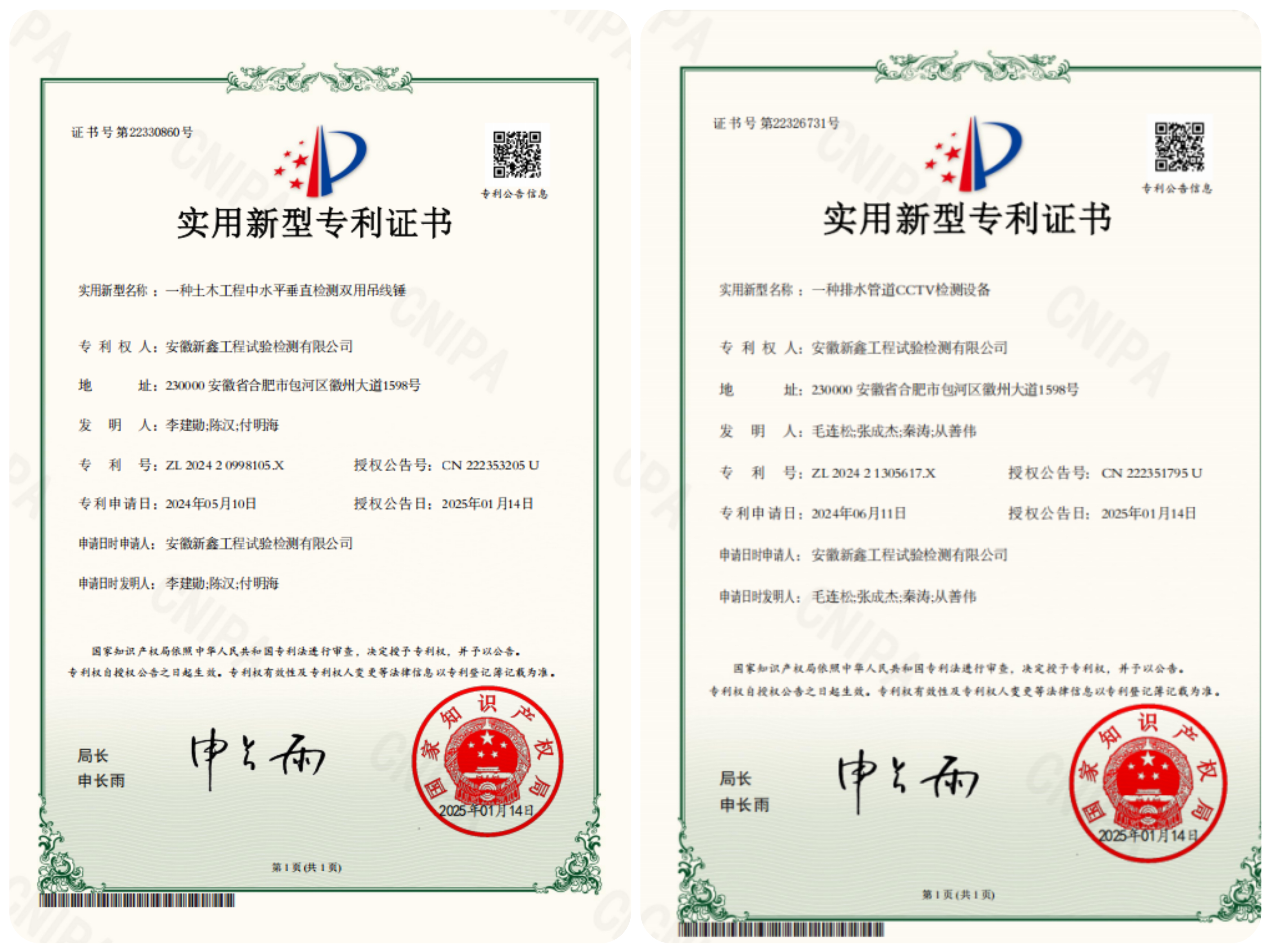 近日,新鑫檢測(cè)申請(qǐng)的兩項(xiàng)實(shí)用新型專利《一種排水管道CCTV檢測(cè)設(shè)備》和《一種土木工程中水平垂直檢測(cè)雙用吊線錘》獲得國家知識(shí)產(chǎn)權(quán)局授權(quán)。