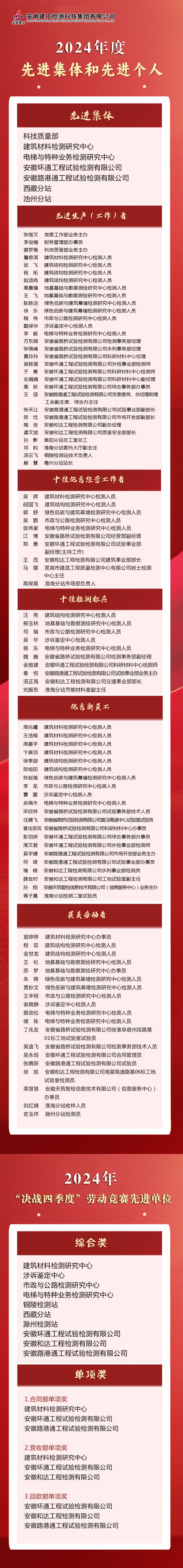 2月26日至28日,安徽建工檢測科技集團(tuán)有限公司一屆三次職代會暨2025年工作會議在合肥召開,會議期間,對2024年度先進(jìn)集體和個(gè)人、“決戰(zhàn)四季度”勞動競賽優(yōu)勝單位進(jìn)行了表彰,公司領(lǐng)導(dǎo)班子成員出席會議并為受表彰單位、個(gè)人頒獎。會議號召,全體員工積極踐行“誠信共贏、卓越創(chuàng)新、忠誠擔(dān)當(dāng)、敬業(yè)清正”集團(tuán)核心價(jià)值觀,振奮精神,開拓進(jìn)取,奮力譜寫建工檢測改革發(fā)展新篇章,為推動建工集團(tuán)轉(zhuǎn)型發(fā)展、高質(zhì)量發(fā)展、大發(fā)展貢獻(xiàn)更大力量。