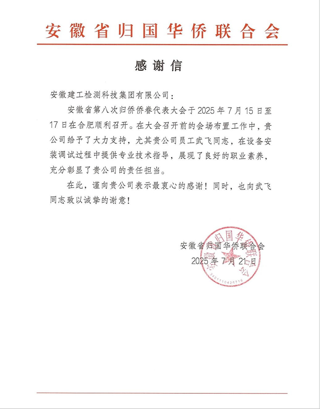 近日,安徽省歸國華僑聯(lián)合會向建工檢測發(fā)來感謝信,對公司在安徽省第八次歸僑僑眷代表大會召開前會場布置工作中的支持表示感謝,對公司的責任擔當和員工的職業(yè)素養(yǎng)給予充分肯定。