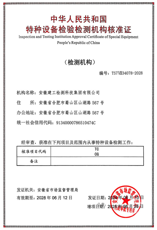 此項(xiàng)資質(zhì)獲得后,公司成為安徽省內(nèi)唯一符合城市更新鋼制壓力管道焊縫檢測(cè)驗(yàn)收標(biāo)準(zhǔn)的檢測(cè)機(jī)構(gòu)(同時(shí)滿足特種設(shè)備無損檢測(cè)專項(xiàng)資質(zhì)許可、建設(shè)工程質(zhì)量檢測(cè)機(jī)構(gòu)核準(zhǔn)、人員資質(zhì)配備、CMA 資質(zhì)認(rèn)定四個(gè)方面驗(yàn)收要求)。