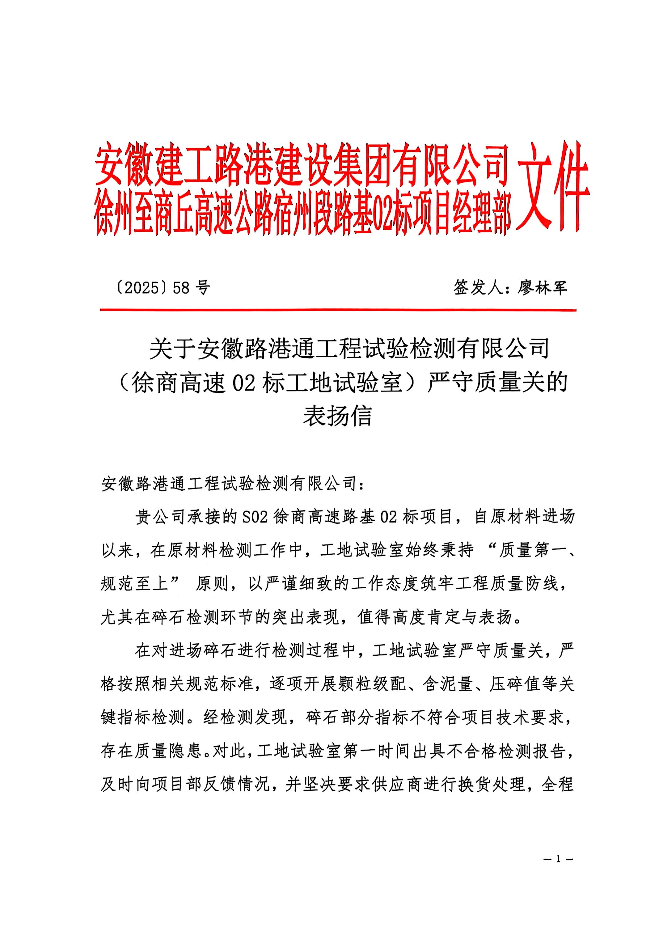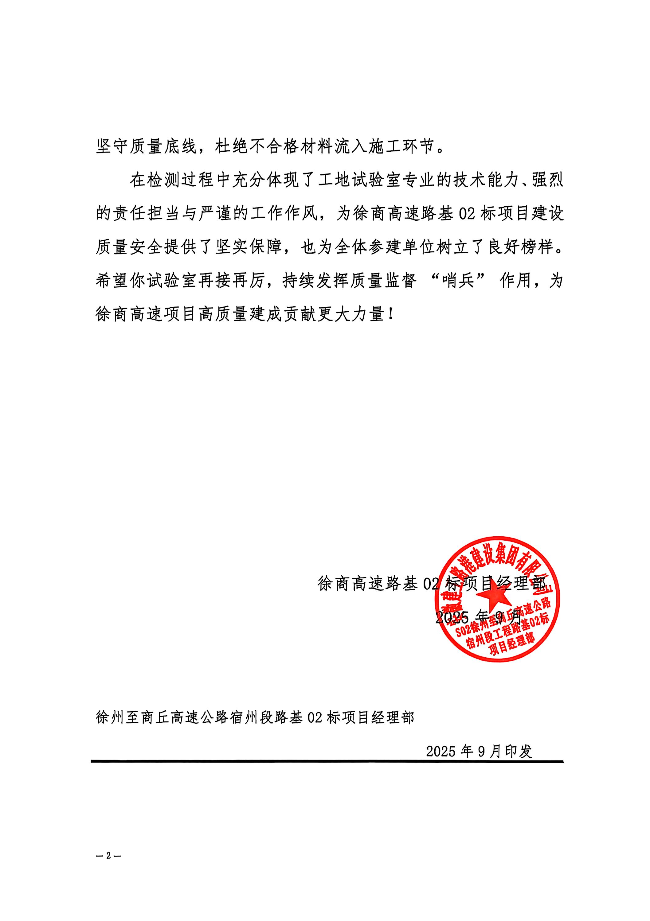 近日,S02徐商高速路基02標(biāo)項(xiàng)目試驗(yàn)室收到表揚(yáng)信,信中對(duì)其在項(xiàng)目建設(shè)過程中嚴(yán)格把控質(zhì)量,切實(shí)保障項(xiàng)目建設(shè)進(jìn)度和質(zhì)量安全方面的突出表現(xiàn)進(jìn)行通報(bào)表彰。