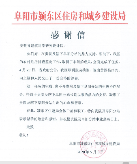 近日,安徽建科收到阜陽市潁東區(qū)住建局發(fā)來的感謝信,對(duì)安徽建科以及所屬質(zhì)檢二站阜陽分站在潁東區(qū)排查危房工作中做出的重要貢獻(xiàn)表述感謝。