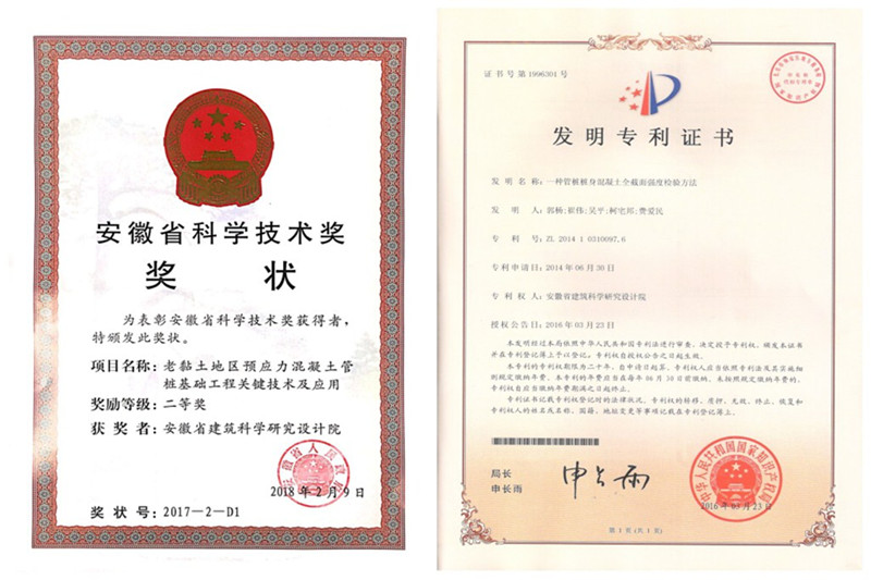 2012年-2019年,《一種管樁樁身混凝土全截面強(qiáng)度檢驗方法》等多項發(fā)明專利獲得授權(quán),《預(yù)應(yīng)力混凝土管樁技術(shù)標(biāo)準(zhǔn)》等十余部標(biāo)準(zhǔn)或規(guī)程發(fā)布實施,安徽省科學(xué)技術(shù)獎、華夏建設(shè)科學(xué)技術(shù)獎、中國建筑業(yè)協(xié)會科學(xué)技術(shù)獎、安徽省優(yōu)秀勘察設(shè)計獎等各類榮譽(yù)和獎項不勝枚舉;