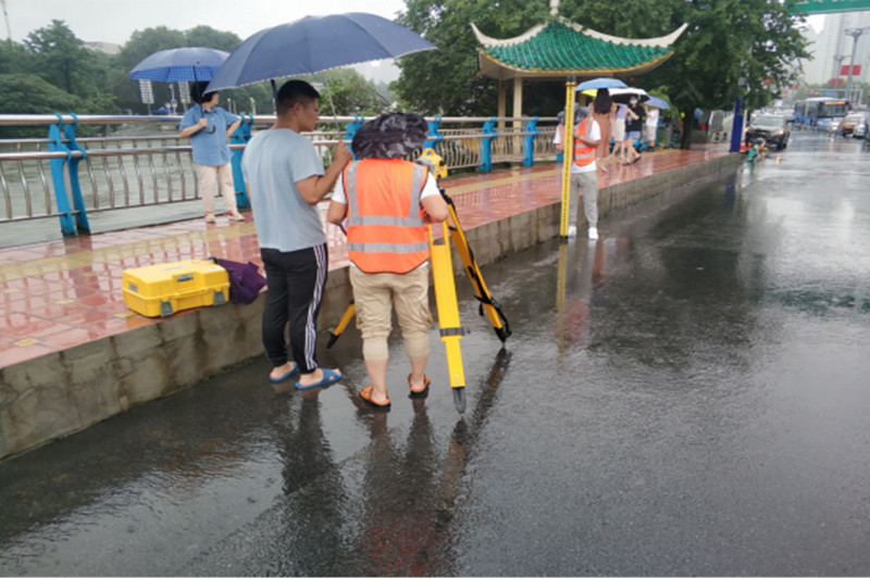 7月17日20時至19日6時,合肥市區(qū)遭受70~80年一遇的強暴雨襲擊,暴雨造成合肥市區(qū)多地內(nèi)澇,上游水庫泄洪,南淝河水位極速上漲,超警戒水位約2米。其中,長江路橋橋下水位超出設計洪水水位,橋梁上部結(jié)構(gòu)局部淹沒。由于該橋自重較輕,洪水通過時會對橋梁產(chǎn)生浮力和沖擊力。為確保橋梁安全,主管部門對該橋采取重車壓橋的應急措施,并委托道橋所對過程中的變形情況進行監(jiān)測。道橋所技術(shù)人員布設監(jiān)測點、采用高精度電子水準儀對橋面及橋墩進行監(jiān)測,從而判斷橋梁的豎向變形情況。監(jiān)測工作從19日上午10時開始,每小時監(jiān)測一次,持續(xù)至次日凌晨3時水位明顯回落。在確保洪水退到安全水位后,道橋所監(jiān)測人員方撤離現(xiàn)場。