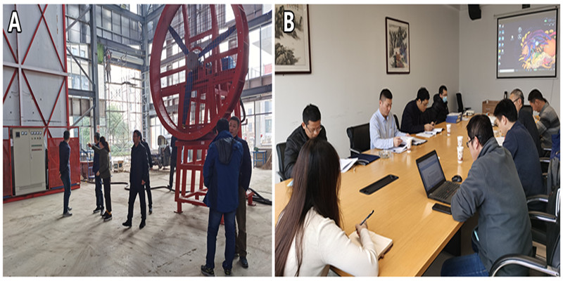 幕墻檢測設(shè)備驗收:(A)專家現(xiàn)場勘驗設(shè)備;(B)驗收報告會