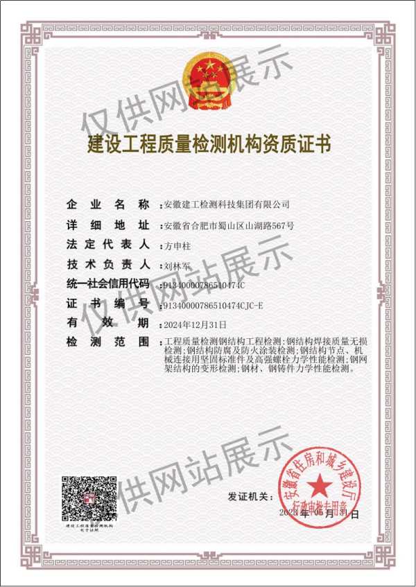 建設(shè)工程質(zhì)量檢測機構(gòu)資質(zhì)證書(鋼結(jié)構(gòu))