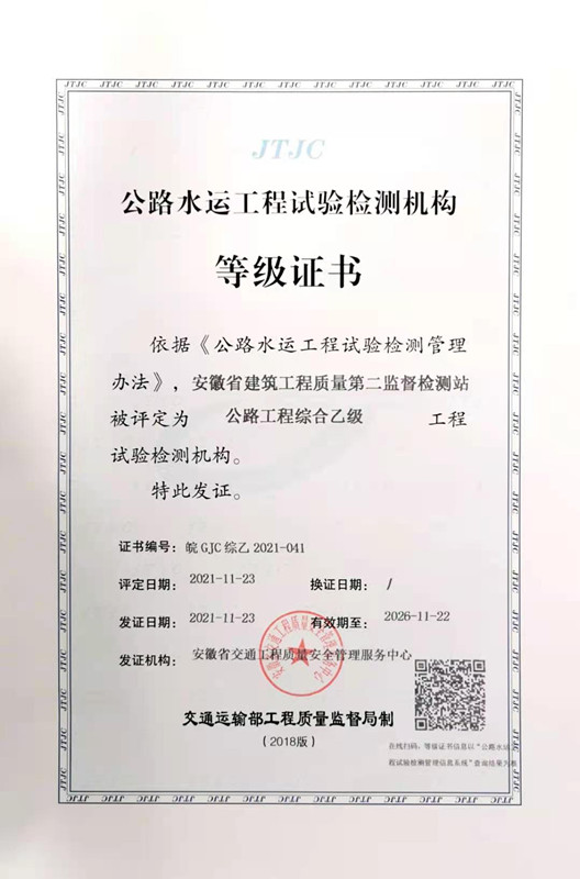 11月23日,從安徽省交通工程質(zhì)量安全管理服務(wù)中心傳來喜訊,二站順利通過公路工程綜合乙級(jí)等級(jí)評定。