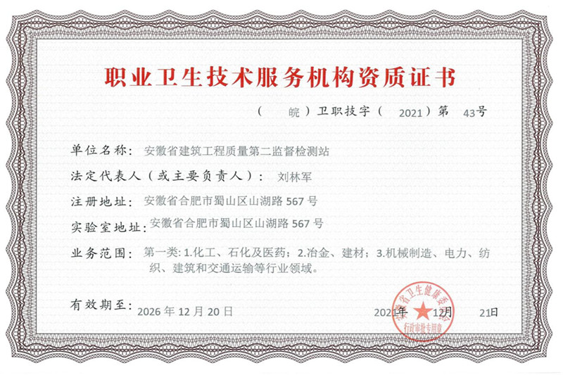 近日,經(jīng)安徽省衛(wèi)健委認定,二站順利取得職業(yè)衛(wèi)生技術(shù)服務(wù)機構(gòu)資質(zhì)證書。