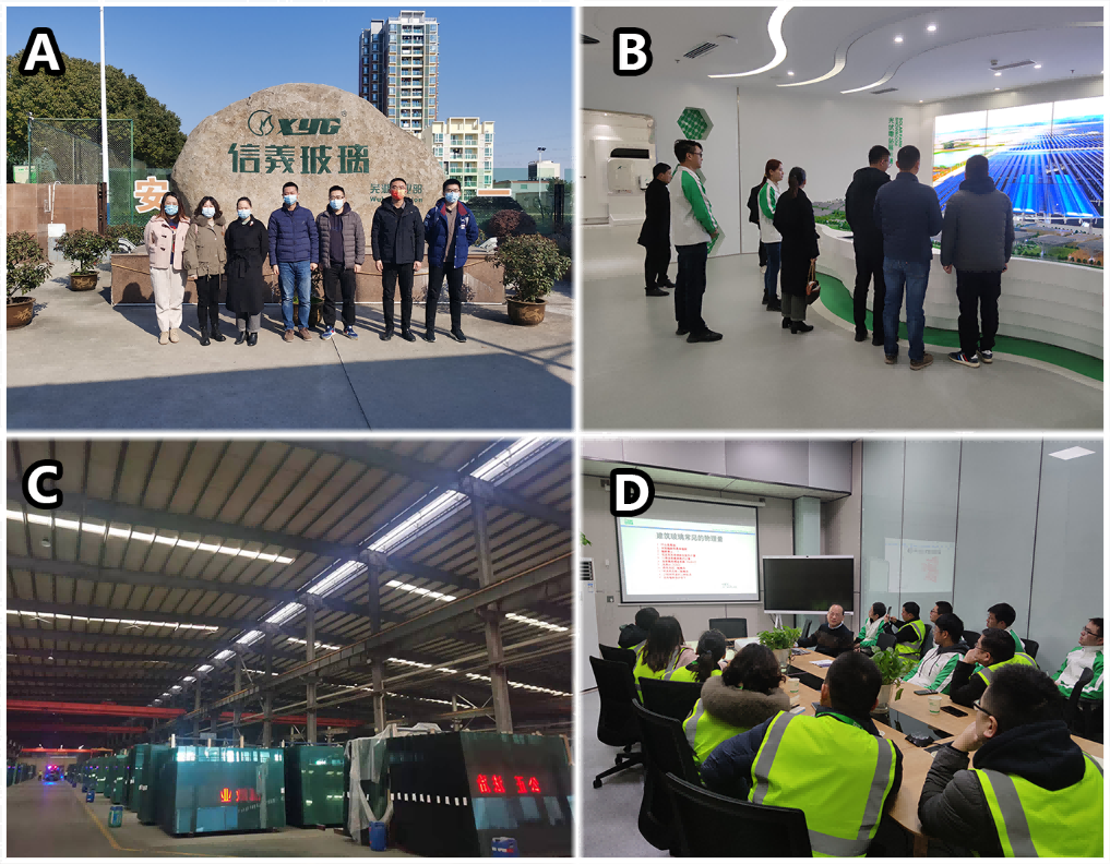 ((A) 廠區(qū)門口合影;(B) 參觀展廳;(C) 參觀倉(cāng)庫(kù);(D) 技術(shù)交流)