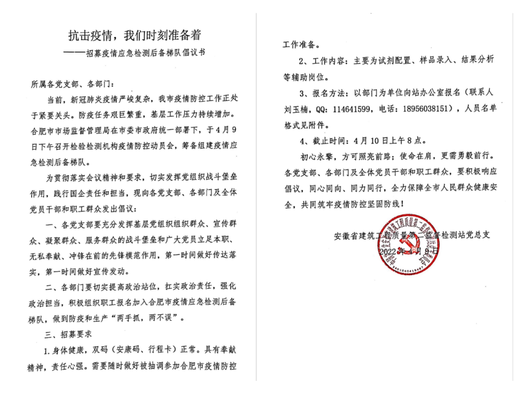 當(dāng)晚,全站上下聞令而動(dòng),積極響應(yīng)征募號(hào)召。截止4月10日8時(shí)許,80余名專業(yè)檢驗(yàn)檢測(cè)人員自愿報(bào)名加入合肥市疫情應(yīng)急檢測(cè)后備梯隊(duì),隨時(shí)準(zhǔn)備接受抽調(diào),隨時(shí)準(zhǔn)備在抗“疫”最前線完成檢驗(yàn)試劑配置、樣品錄入、結(jié)果分析等工作。
