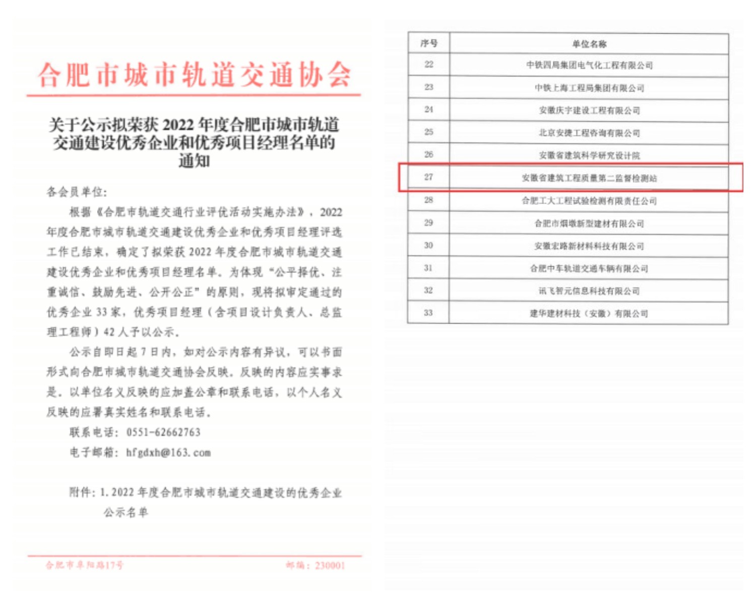 喜訊!建工檢測榮獲2022年度合肥市城市軌道交通建設“優(yōu)秀企業(yè)”稱號